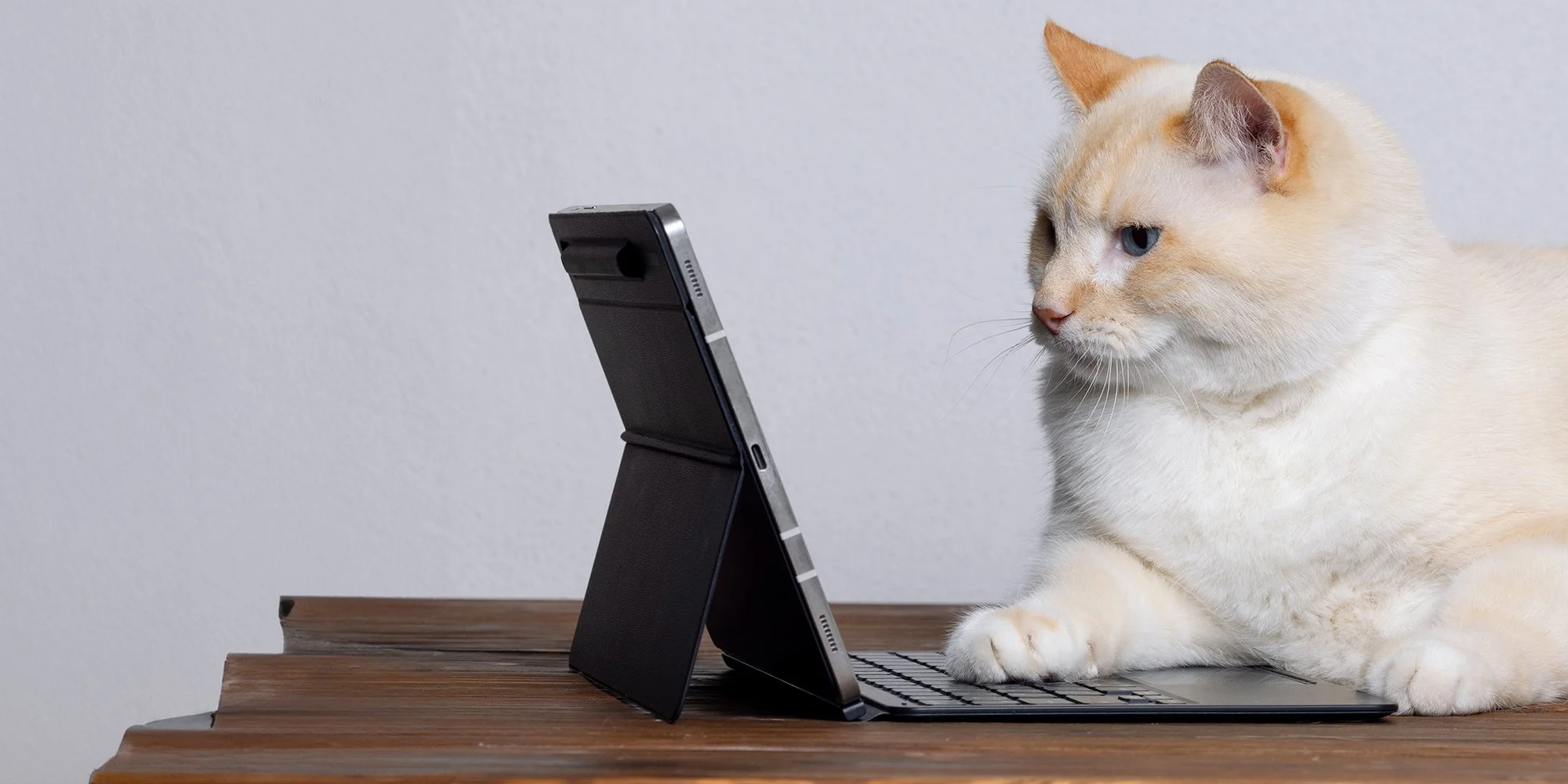 A beige cat sitting in front of a tablet with a keyboard on a wooden surface.