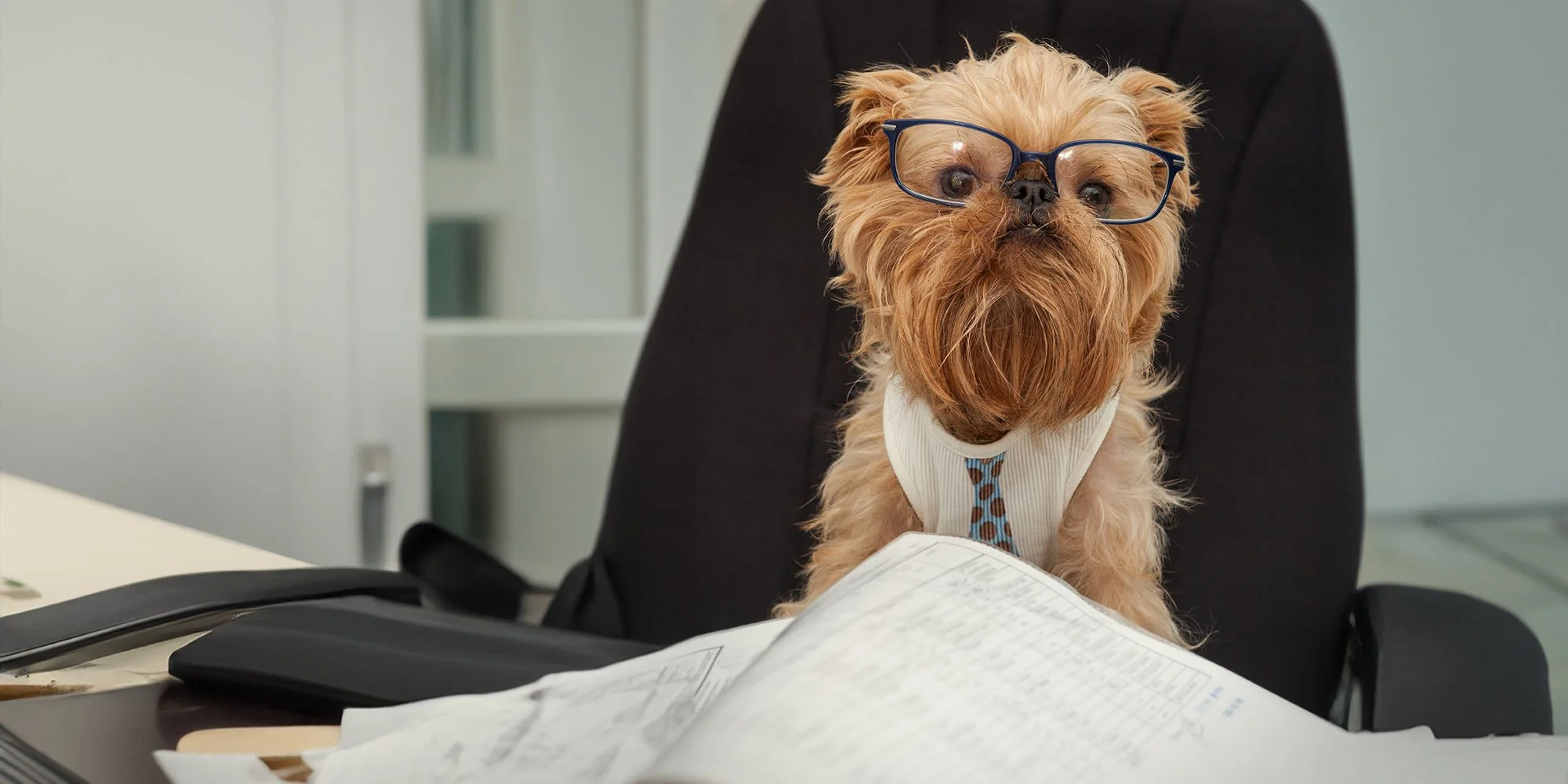 A small dog wearing glasses and a tie sitting at a desk with papers, resembling a professional work setting.